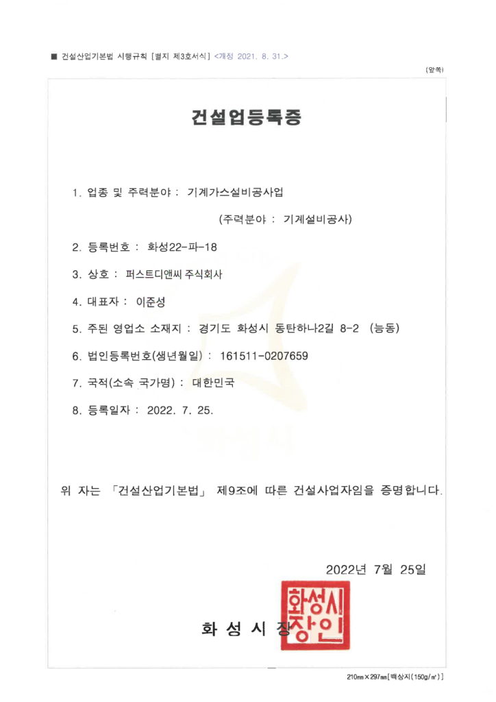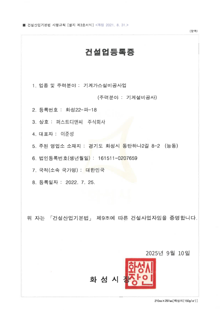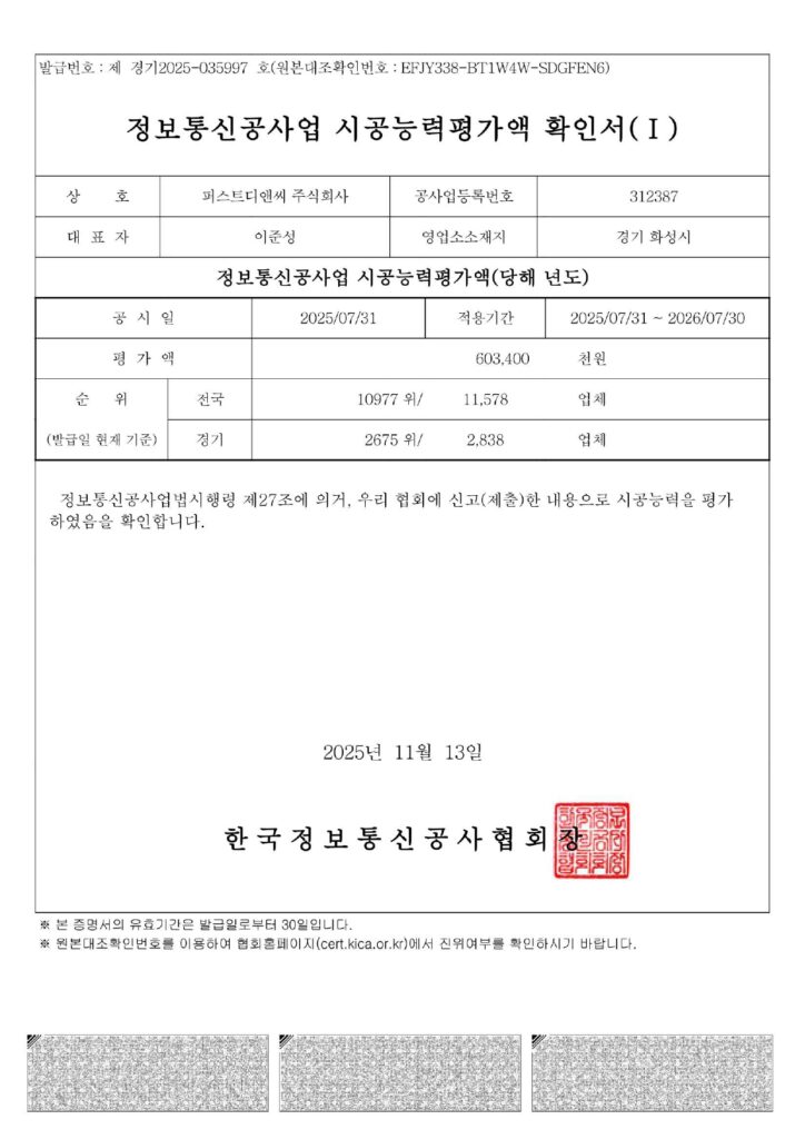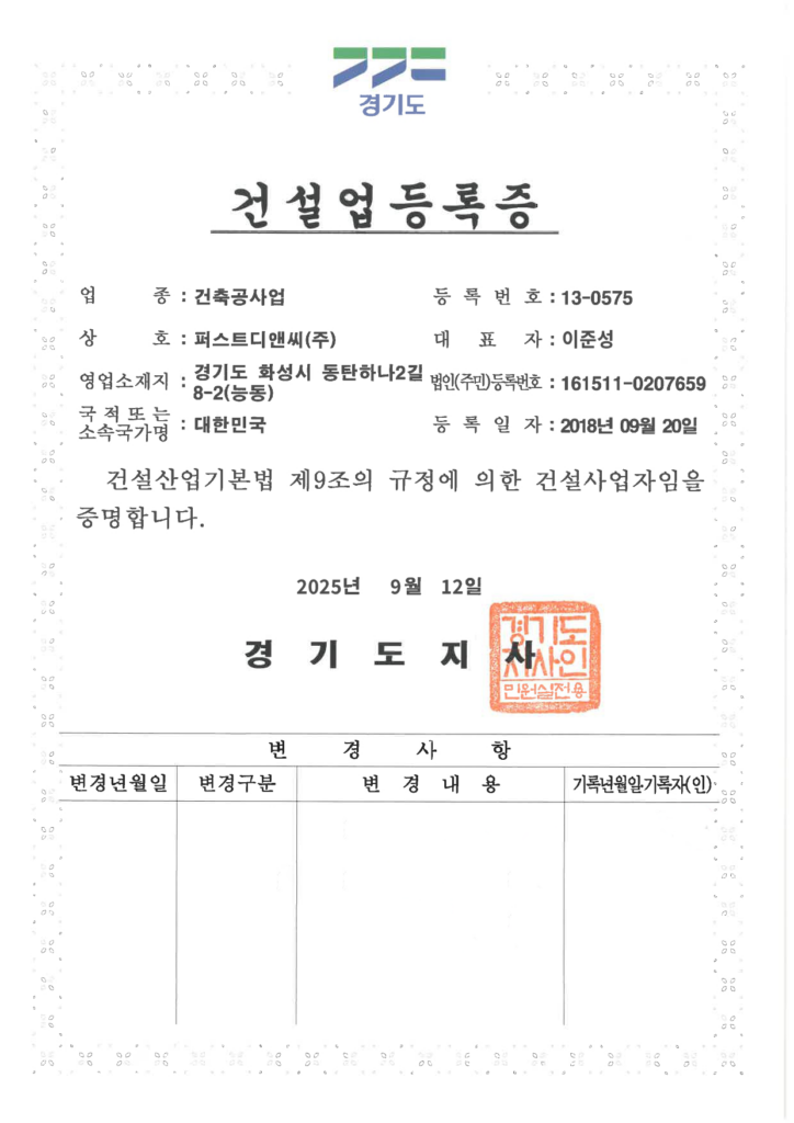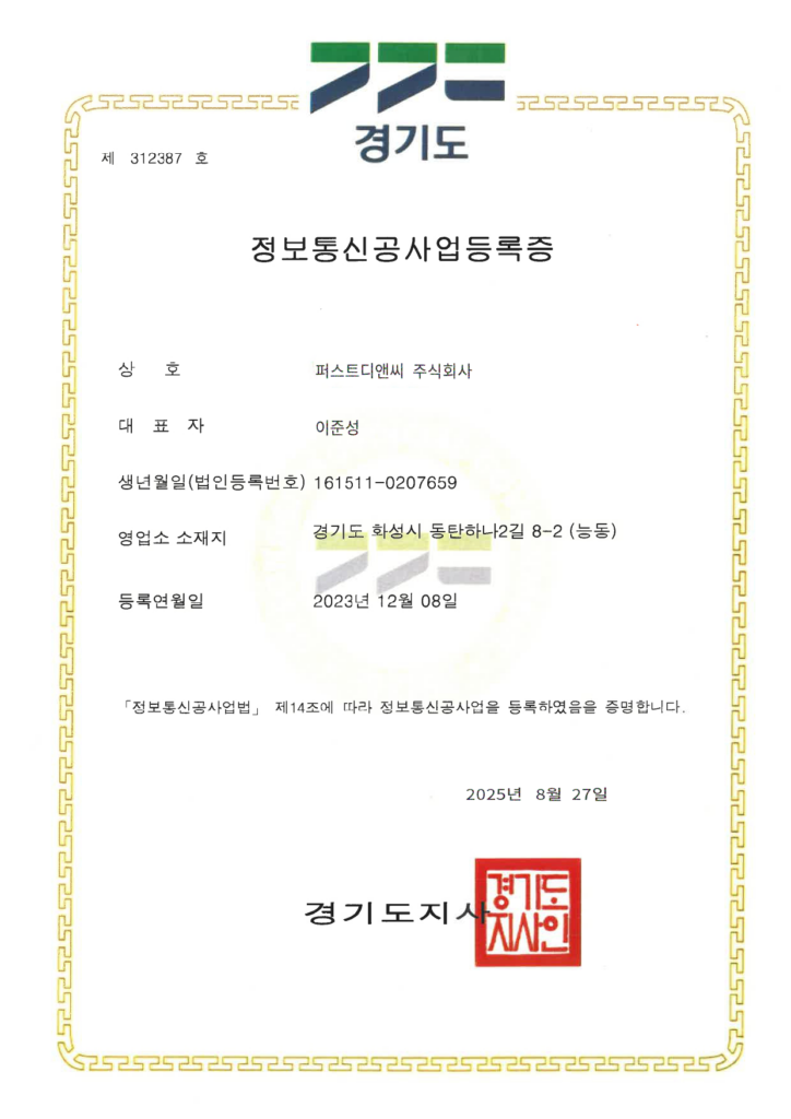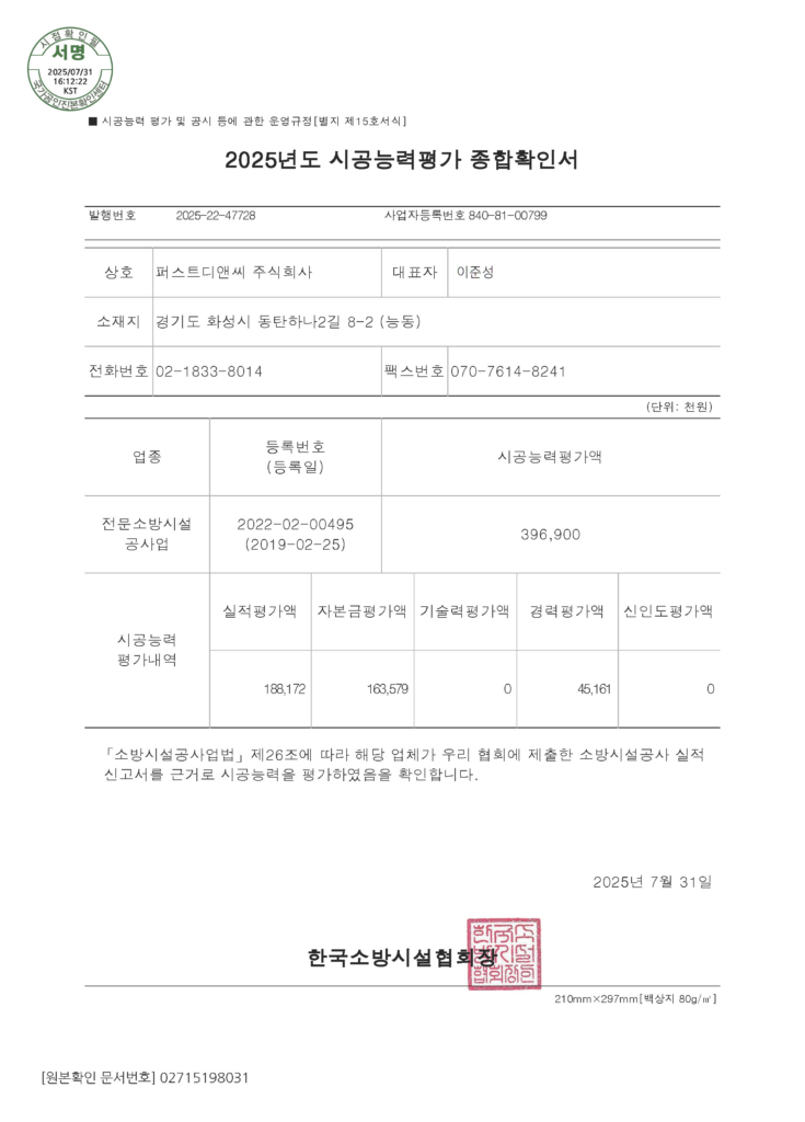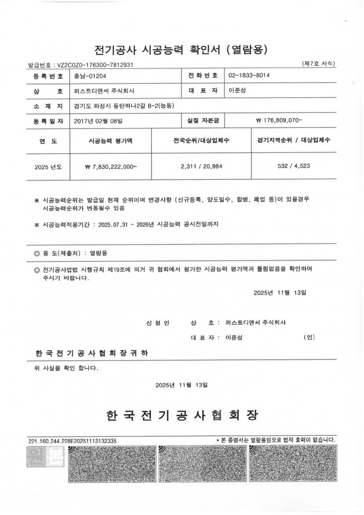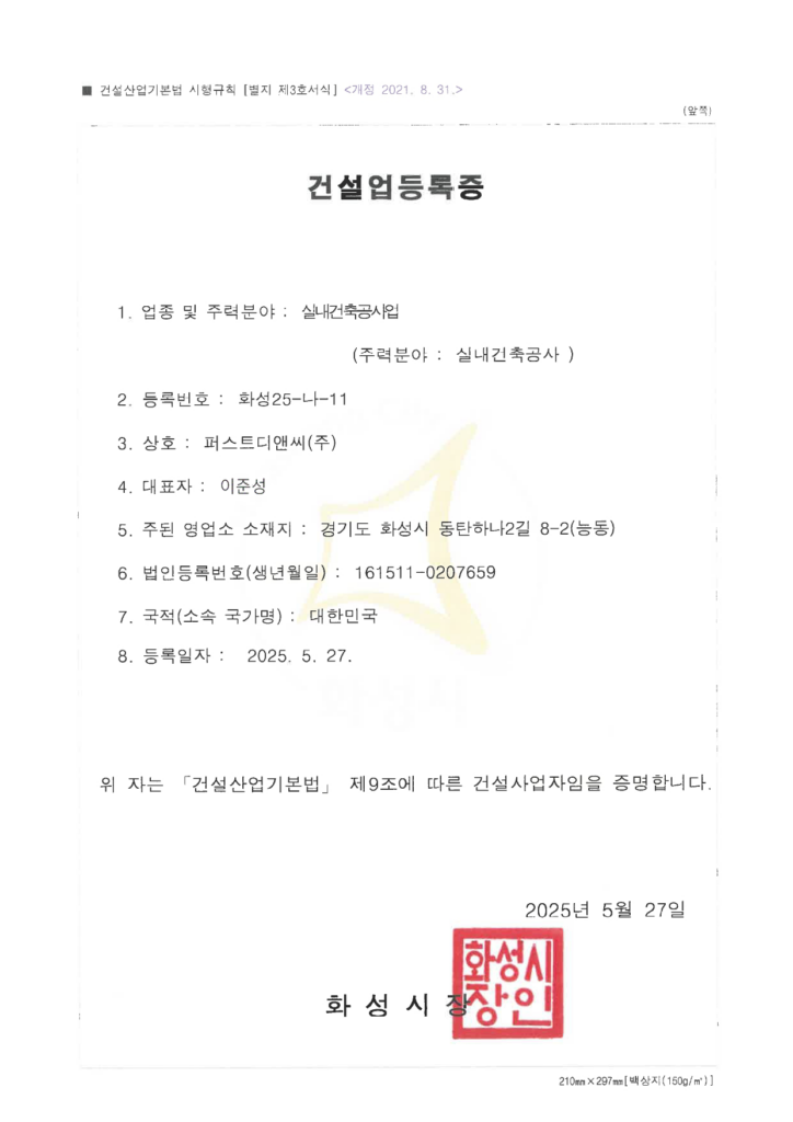 Home > 회사소개 > 인증 및 면허 현황 회사소개 인사말 기업철학/연혁 그룹사 소개 인증 및 면허 현황 인증 및 면허 현황 [퍼스트디앤씨] 퍼스트디앤씨는 6개의 건설업 면허를 보유하고 있으며,각종 기업 인증서와 신용평가서를 통해 전문성과 신뢰성을 객관적으로 입증하고 있습니다. 앞으로도 지속적인 역량 강화와 책임 있는 경영으로 믿을 수 있는 건설 파트너가 되겠습니다. 퍼스트디앤씨 인증 및 면허 현황 전체 문서 다운로드 하기 [면허 현황] 건설업등록증 - 건축공사업 건설업등록증 - 기계가스설비공사업 실내건축공사업 등록증 전기공사업 등록증 소방시설업 등록증 정보통신공사업 등록증 [인증 현황] 기업부설연구소 인정서 ISO 45001 ISO 9001 메인비즈 확인서 직접생산확인증명서 전기시스템, 조명 부품 등 직접생산확인증명서태양광발전장치 공장등록증명서 [신용평가서 및 시공능력평가액 확인서] 신용평가서 : 이크레더블 건축 시공능력공시액 내역 확인서 (2025) 기계설비 시공능력 순위 확인서(2025) 전기공사 시공능력확인서(2025) 정보통신공사업 시공능력평가액 확인서 (2025) 소방시공능력 종합확인서(2025)