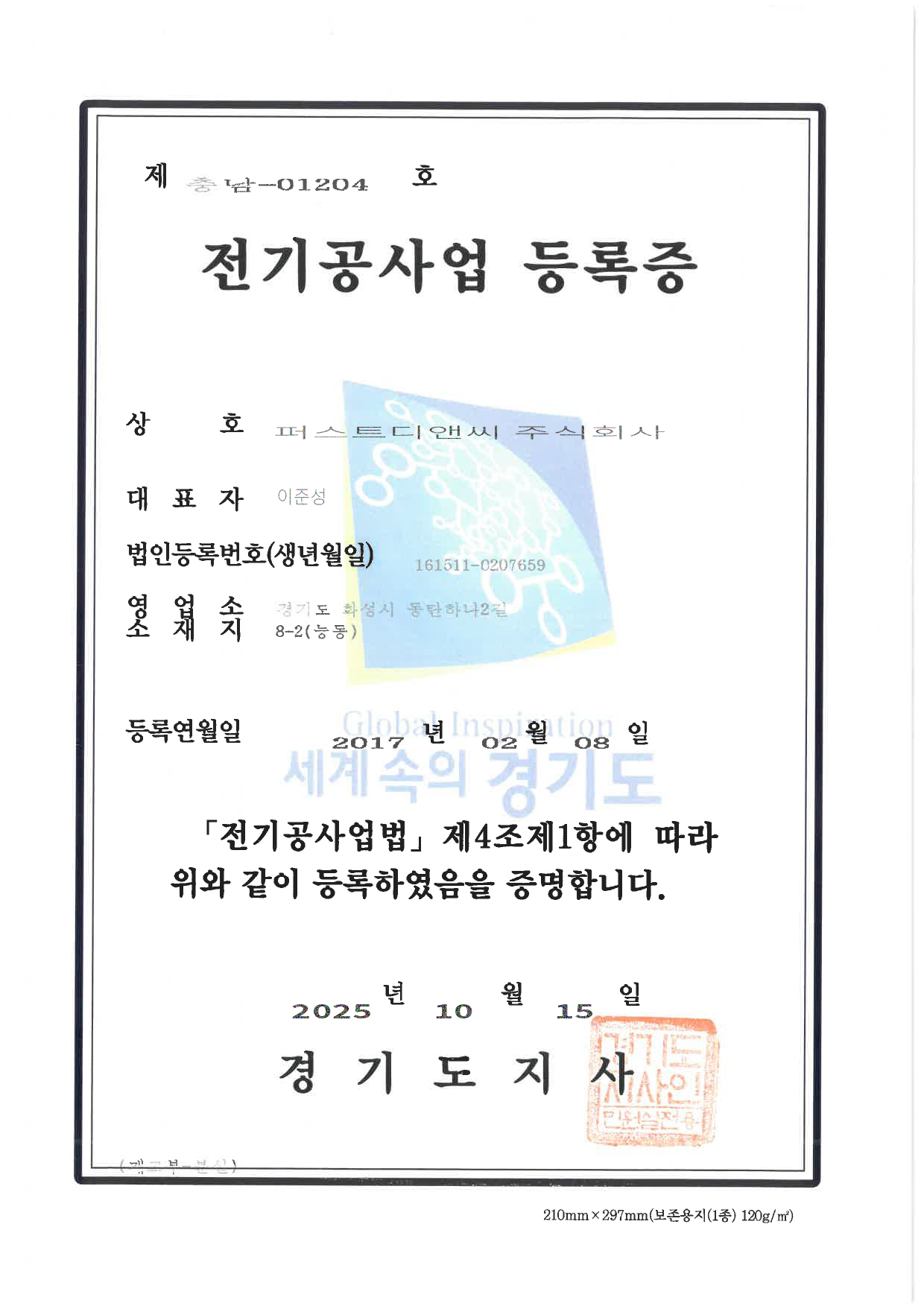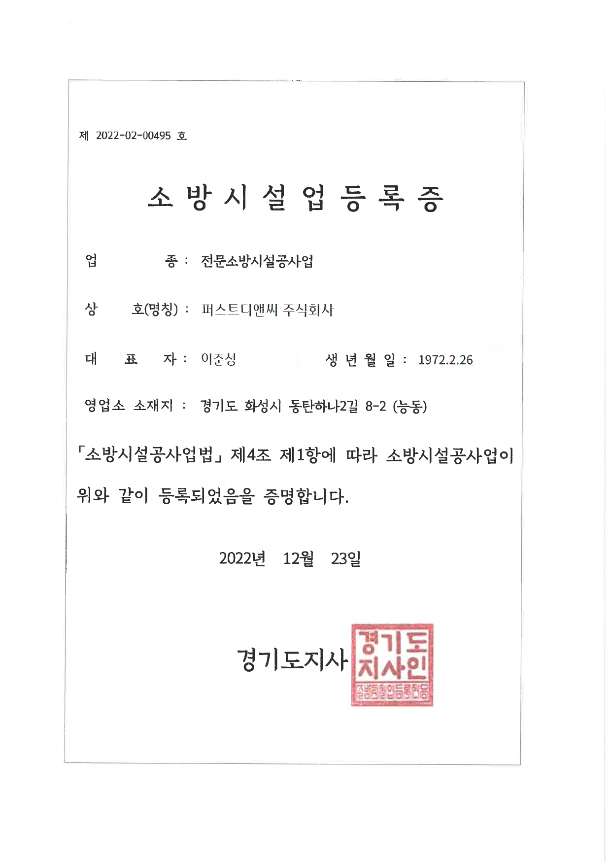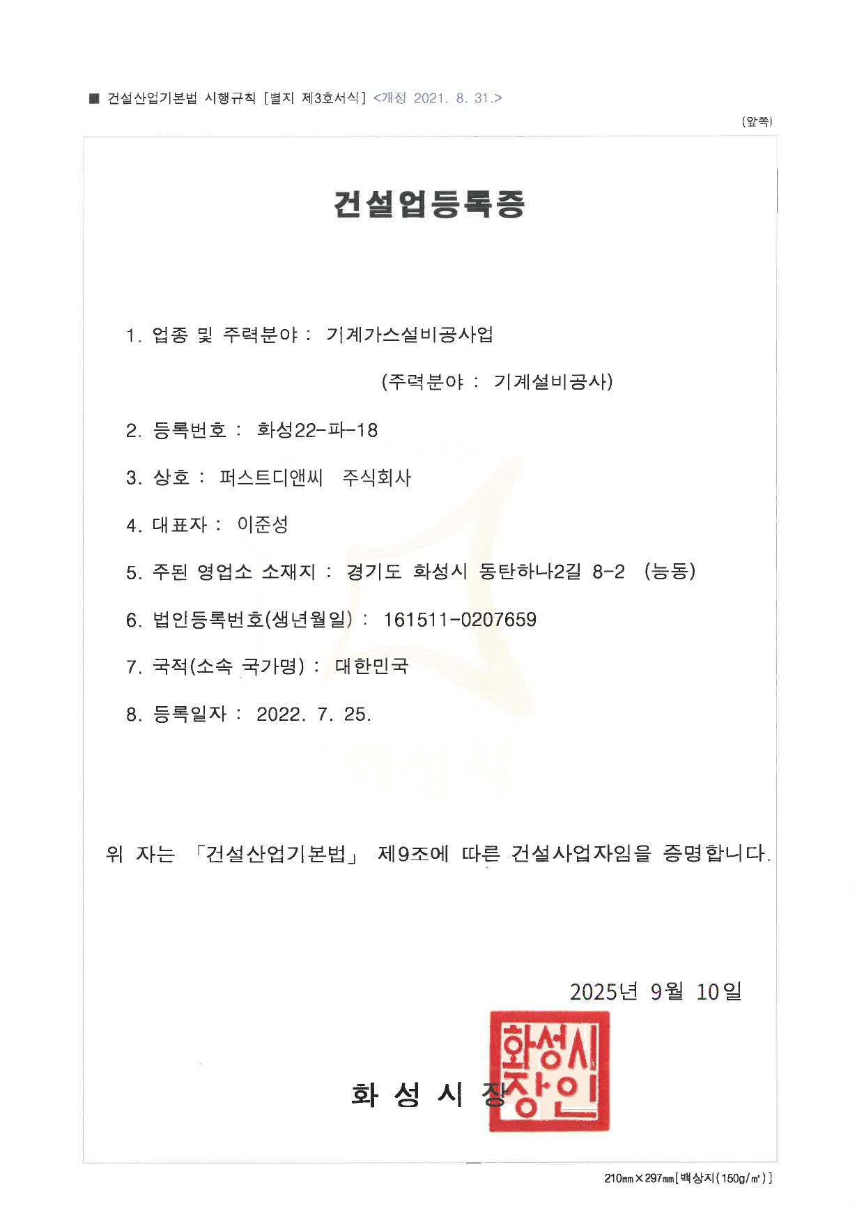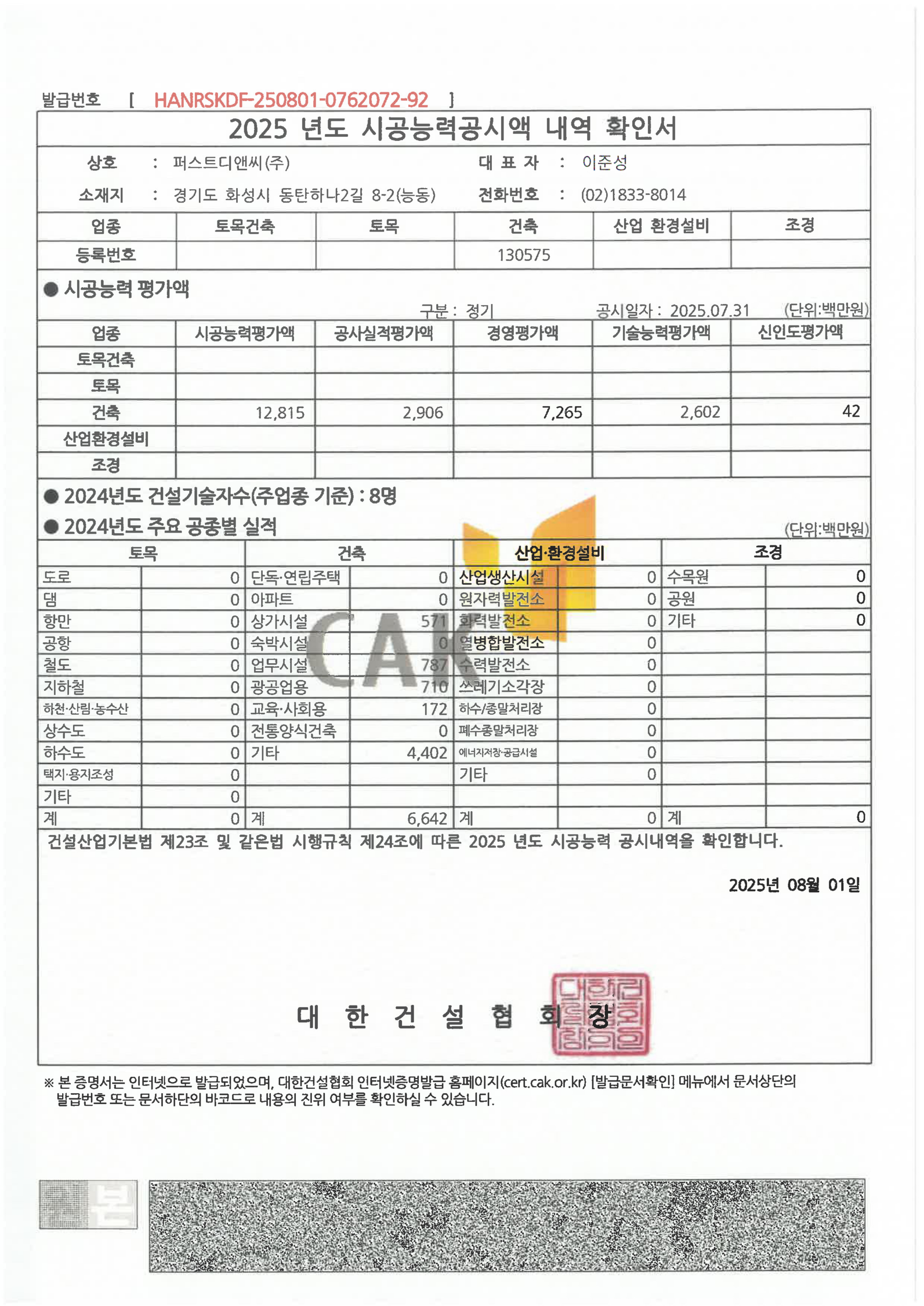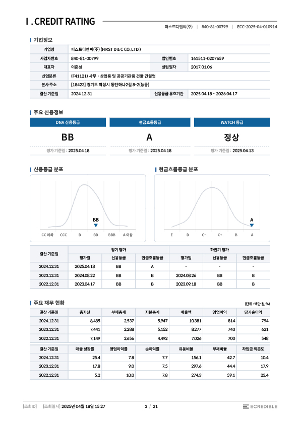 Home > 회사소개 > 인증 및 면허 현황 회사소개 인사말 기업철학/연혁 그룹사 소개 인증 및 면허 현황 인증 및 면허 현황 [퍼스트디앤씨] 퍼스트디앤씨는 6개의 건설업 면허를 보유하고 있으며,각종 기업 인증서와 신용평가서를 통해 전문성과 신뢰성을 객관적으로 입증하고 있습니다. 앞으로도 지속적인 역량 강화와 책임 있는 경영으로 믿을 수 있는 건설 파트너가 되겠습니다. 퍼스트디앤씨 인증 및 면허 현황 전체 문서 다운로드 하기 [면허 현황] 건설업등록증 - 건축공사업 건설업등록증 - 기계가스설비공사업 실내건축공사업 등록증 전기공사업 등록증 소방시설업 등록증 정보통신공사업 등록증 [인증 현황] 기업부설연구소 인정서 ISO 45001 ISO 9001 메인비즈 확인서 직접생산확인증명서 전기시스템, 조명 부품 등 직접생산확인증명서태양광발전장치 공장등록증명서 [신용평가서 및 시공능력평가액 확인서] 신용평가서 : 이크레더블 건축 시공능력공시액 내역 확인서 (2025) 기계설비 시공능력 순위 확인서(2025) 전기공사 시공능력확인서(2025) 정보통신공사업 시공능력평가액 확인서 (2025) 소방시공능력 종합확인서(2025)